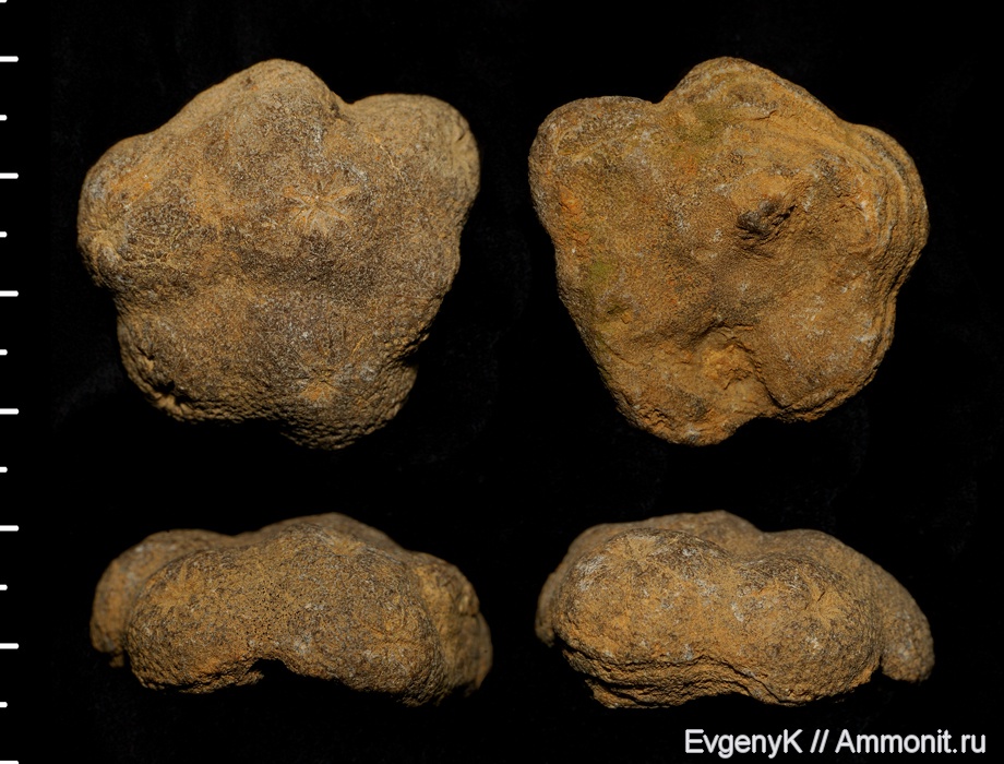Я там (http://ammonit.ru/foto/36501.htm)поменял один из ракурсов (в середине верхнего ряда)- это как раз та сторона, которой губка крепилась к подставке и не попала на предыдущее фото. На ней как бы две отпочковывающиеся губки(?). Мне кажется, что к субстрату эта губка крепилась стороной показанной зеленой стрелкой и на ней я не вижу линий наростания(. | ||||||