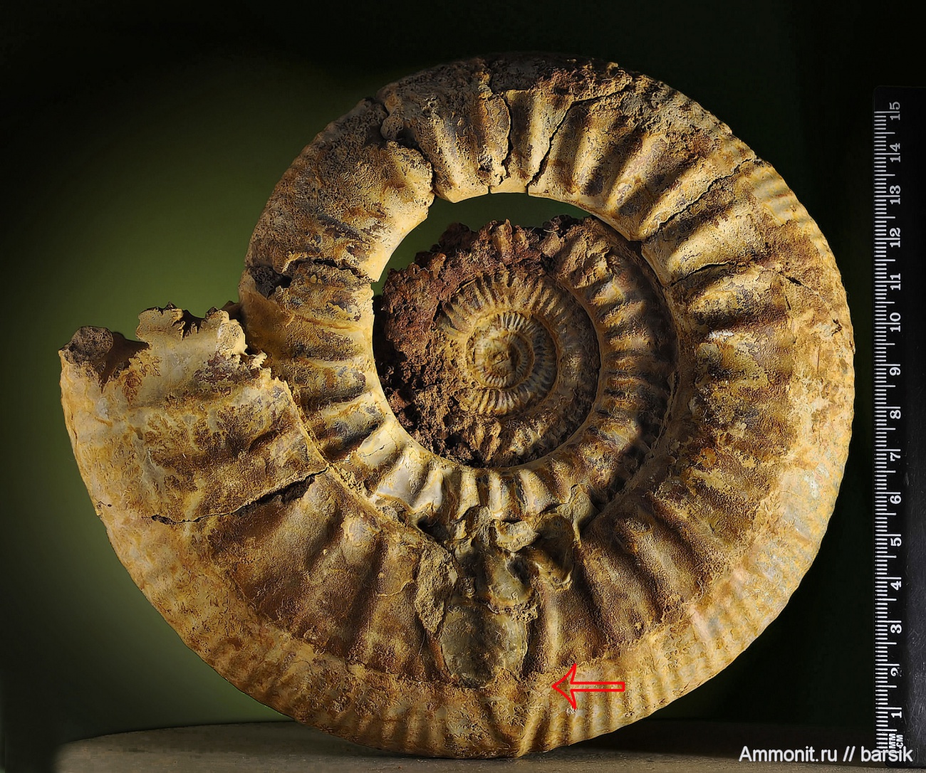 Кроме размера (самый большой в коллекции), образец интересен еще и тем, что у него по стрелке можно заметить нарушение в ребристости. Одно ребро явно выделяется и размером и наклоном. Вентральную сторону это ребро тоже переходит утолщенным и сильно выступает среди остальных. Следующее ребро имеет обратный наклон, по сравнению со всеми другими.