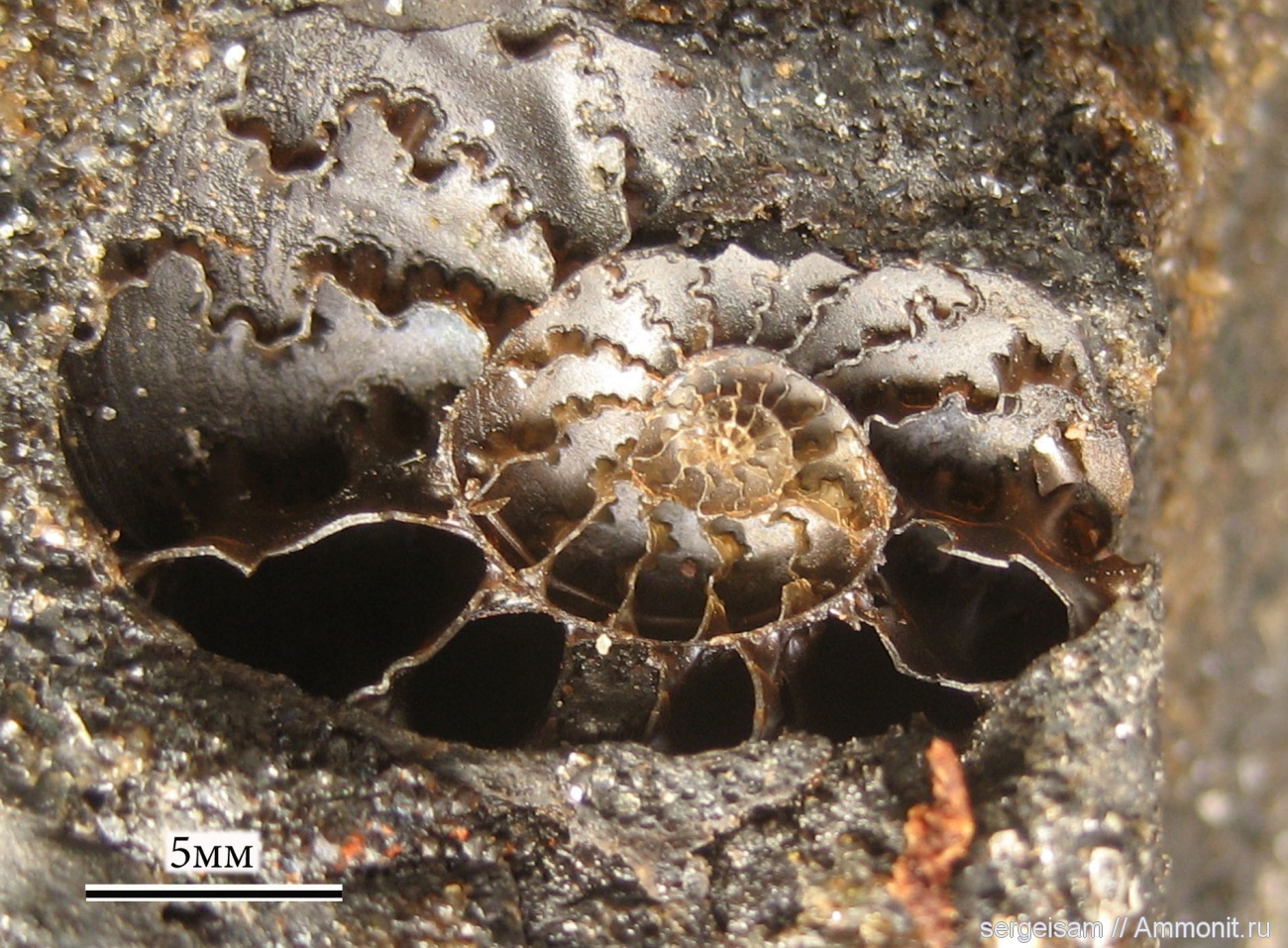 Здесь хорошо видны лопастные линии у аммонита Anadesmoceras на ранней стадии развития. Этот двадцатимилиметровый аммонит был найден весной 2012г.