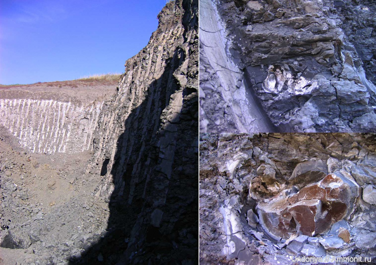 На фото вскрытые экскаватором отложения келловея севернее Саратова, 2006 г. Остатки Cadoceras sp. в слое.