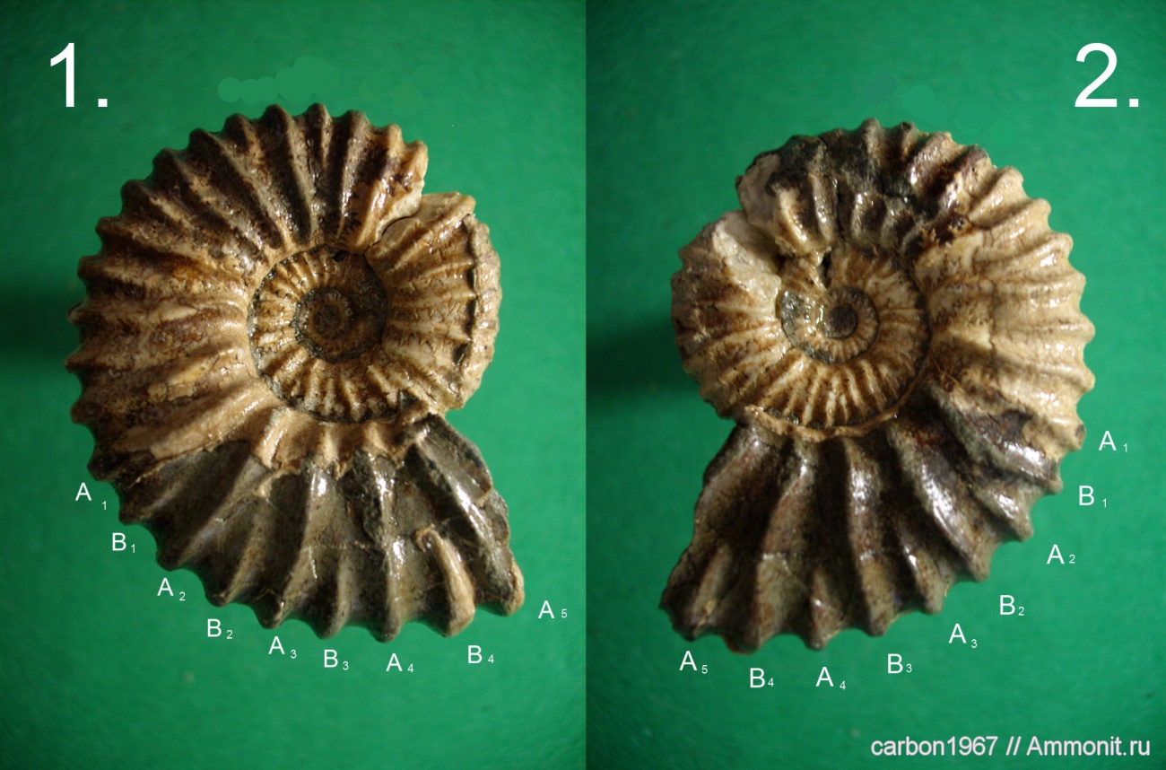 Некоторое время назад, я в коментарии сказал что заметил определённую закономерность изменения скульптуры на жилой камере аммонитов акантогоплитов. И вот наконец то дошли руки сделать фотографию с пояснениями. У одних и тех же рёбр одинаковые индексы. На пример ребро В1 на снимке 1 соответствует ребру В1 на снимке 2.