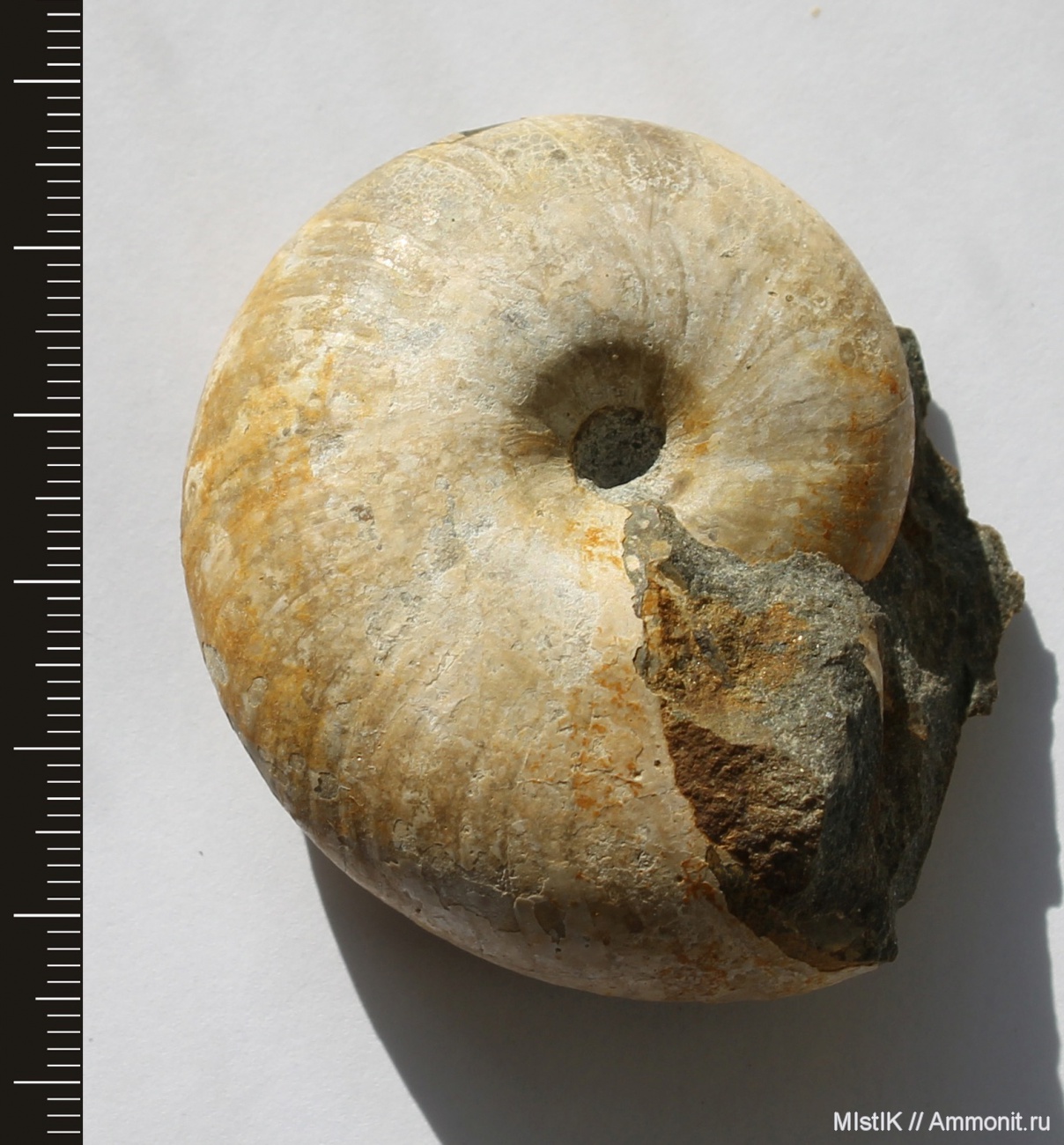 На сайте аммониты этого вида почти все без известковой оболочки,с видимыми пережимами. Но на целой раковине нет никаких следов пережимов, поэтому такого можно ошибочно отнести не туда.