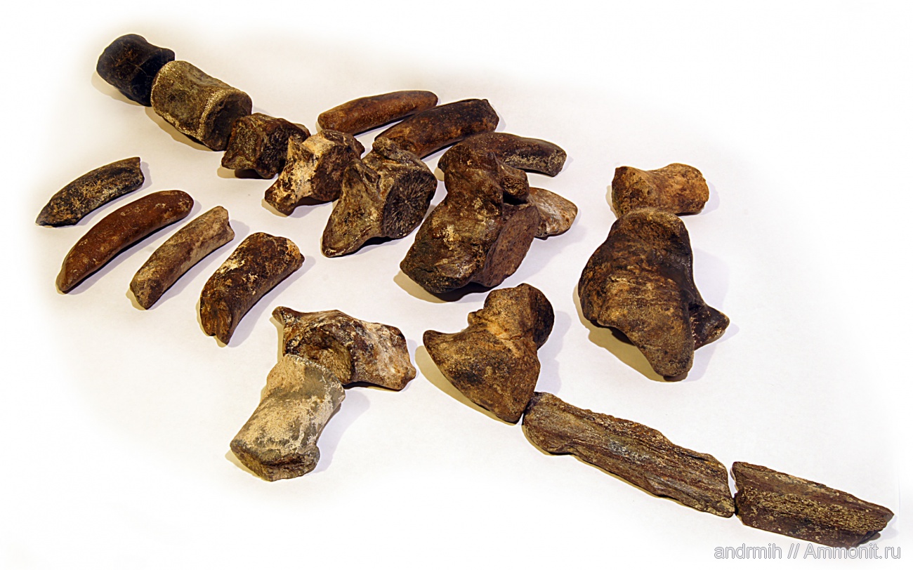 Привет , Вадим. Эти два фрагмента - самые интересные из всего набора. Один - височная кость черепа, фото такой кости лучшей сохранности есть у GEODOK в публикации "Властелин сарматского моря". Второй - фрагмент нижней челюсти, её "опорный" край. Сфотографирую эти кости с разных ракурсов и выложу как отдельные фото, вчера не хватило времени. | ||||||