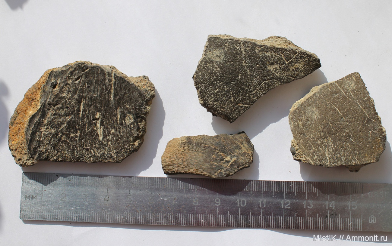 Нижний в середине фрагмент больше похож на жаберную крышку или черепную кость рыбы. Найдены в том же слое где и зубы и кости акул.