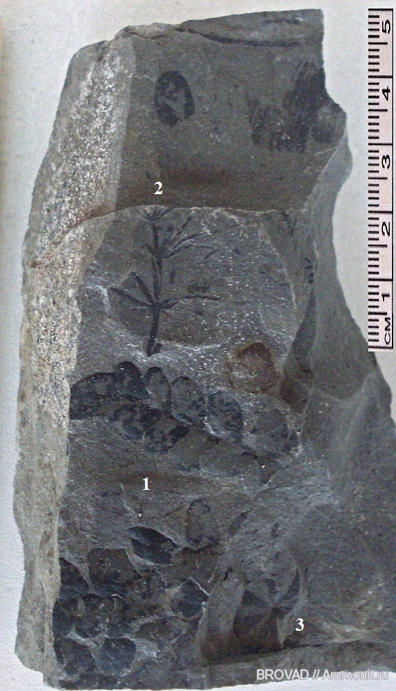 1-Neuropteris sp.; 2-Sphenophyllum sp.; 3-Sphenophyllum majus Bronn.