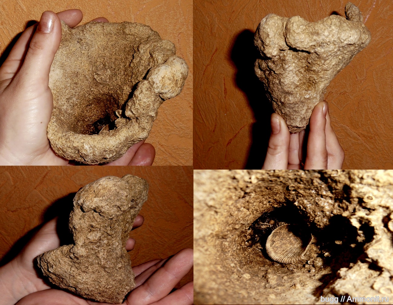Крупная губка с полостью.Интересна еще и тем,что на дне полости после смерти губки приросла двустворка Spondylus.Симферополь,нижний мел.
