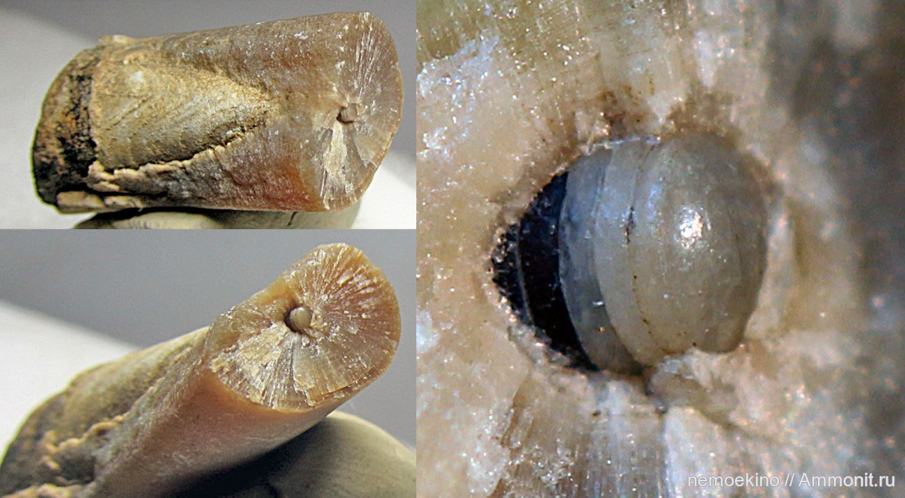 Только это на самом деле не протоконх. Протоконх у белемнитов круглый, вот здесь например его хорошо видно: Белемнит – начало жизни. А это просто камеры фрагмокона - ранние, построенные в детстве, но все-таки уже позже протоконха. Протоконх тут остался в другой половинке ростра. | ||||||