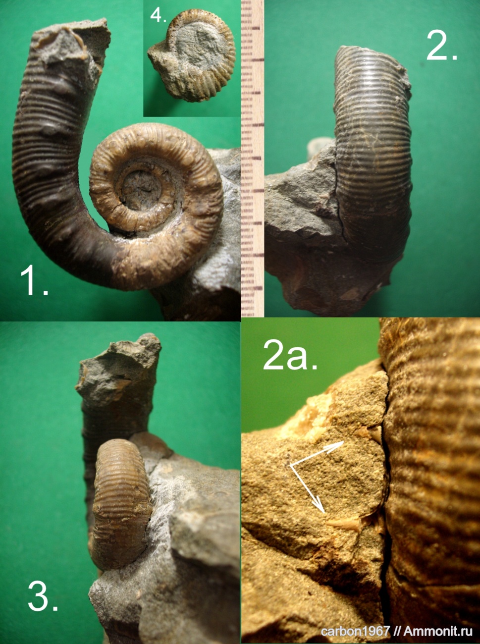 фото - 1;2;2а ( стрелками указаны сохранившиеся шипы );3. Аммонит Acrioceras furcatum.