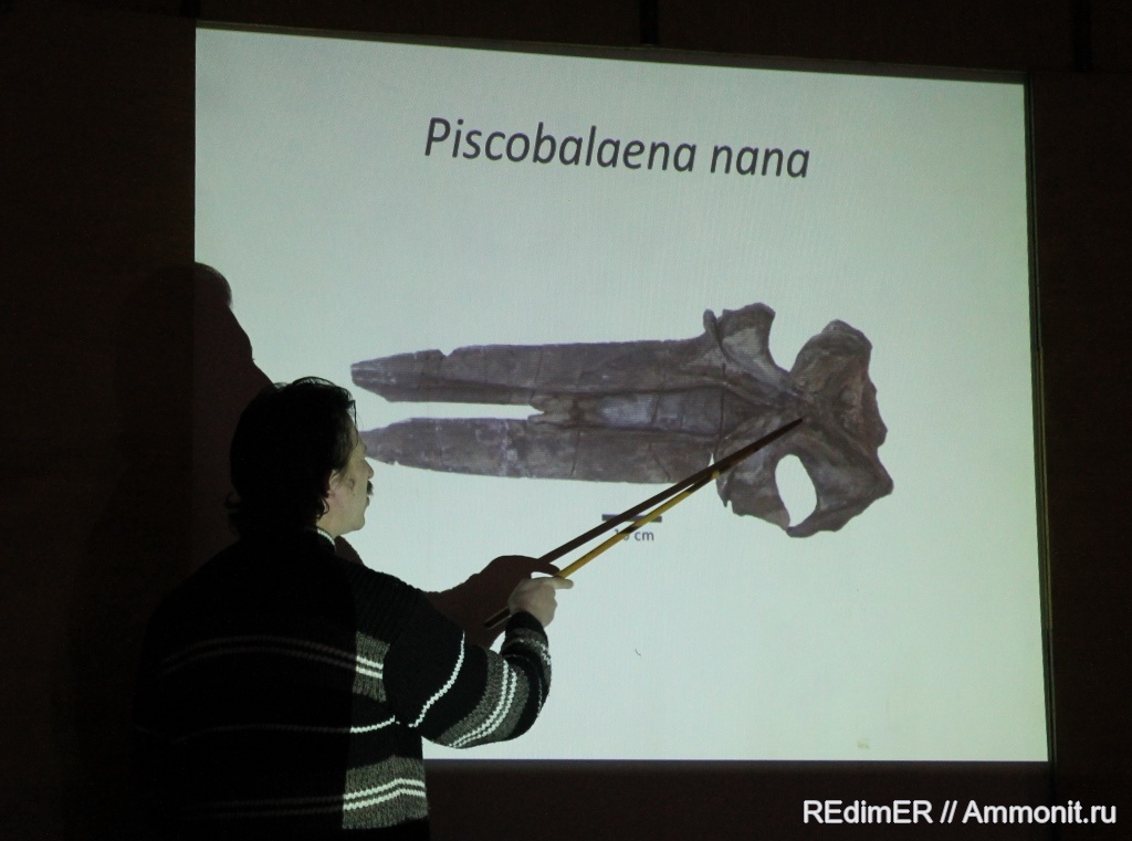 На фото: докладчик обращает внимание на характерную особенность строения черепа китов семейства Cetotheriidae – Х-образную макушку.