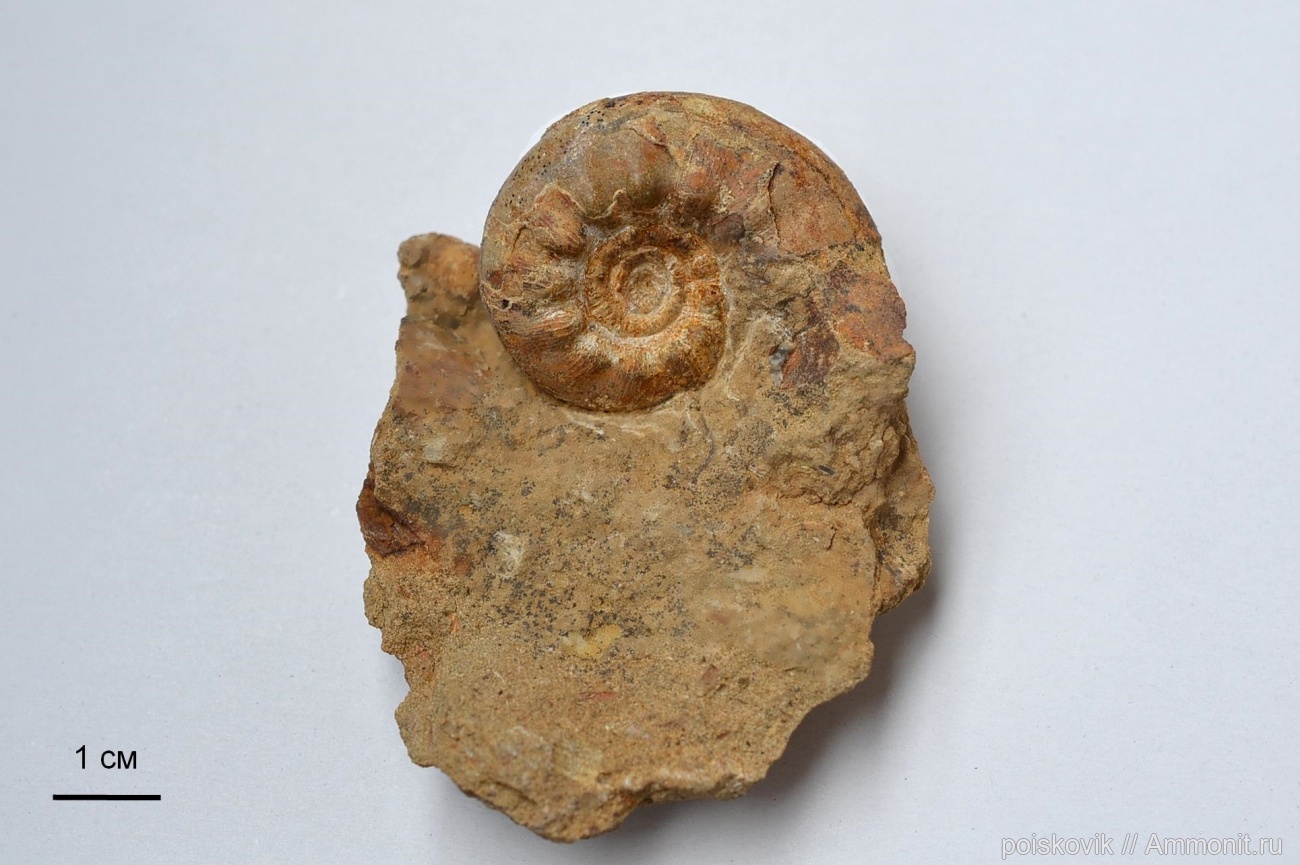Аммонит диаметром 4,4см из песчаников отвалов Псилерахского карьера. Альб.