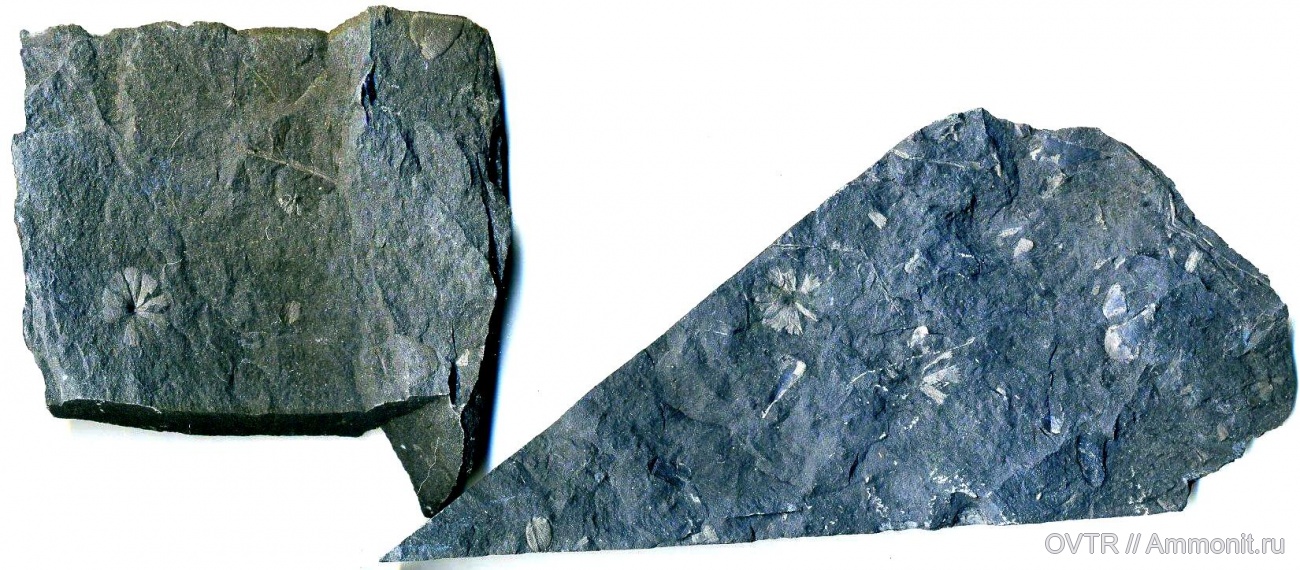 Сфенофиллум: розетка и стебель. Лучшие образцы пока ещё ждут, когда их поднимут:-). Возраст - средний карбон, свита C42: 310-312 млн.лет. ш.Глубокая, Ростовская область. Диаметр розетки около 1см.