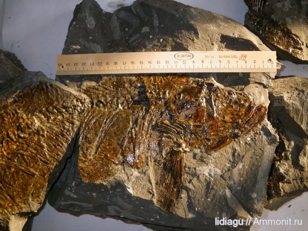 Куски сланца немного пропитала слабым раствором ПВА, т.к. очень быстро расслаиваются, а сам отпечаток покрыла прозрачным лаком для ногтей. Общая длина рыбки составляет 50см. Жаль нет хвоста. Ушел в добычу шахтерам. | ||||||