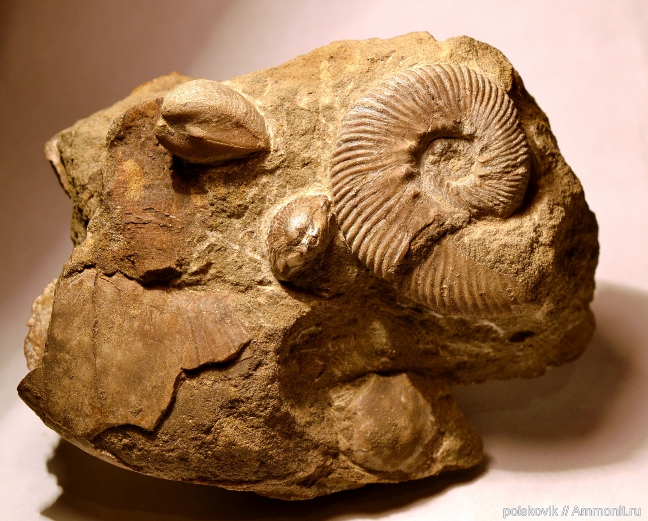 Аммонит и фрагмент крупного аммонита, двустворки и брахиопода. Берриас.