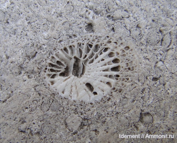 Это одиночный четырехлучевой коралл ругоза каменноугольного возраста. А вокруг мелкие спиральки - фораминиферы Fusulinida. Известняк явно подмосковный и свеже-распиленный, все здорово видно, камень не успел выветрится и растворится. | ||||||