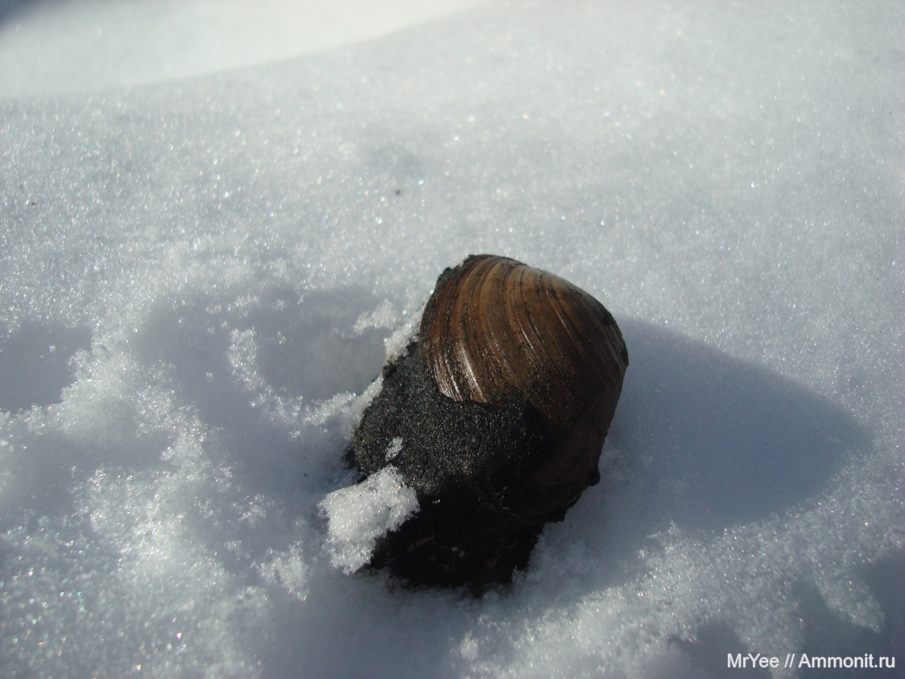 Потому, что палеонтологи уже оттаяли а снег ещё нет) Вообще эту двустворку мне сохранить не удалось, а это, так сказать, фото с места находки. Место раскопок сейчас выглядит так так. | ||||||
