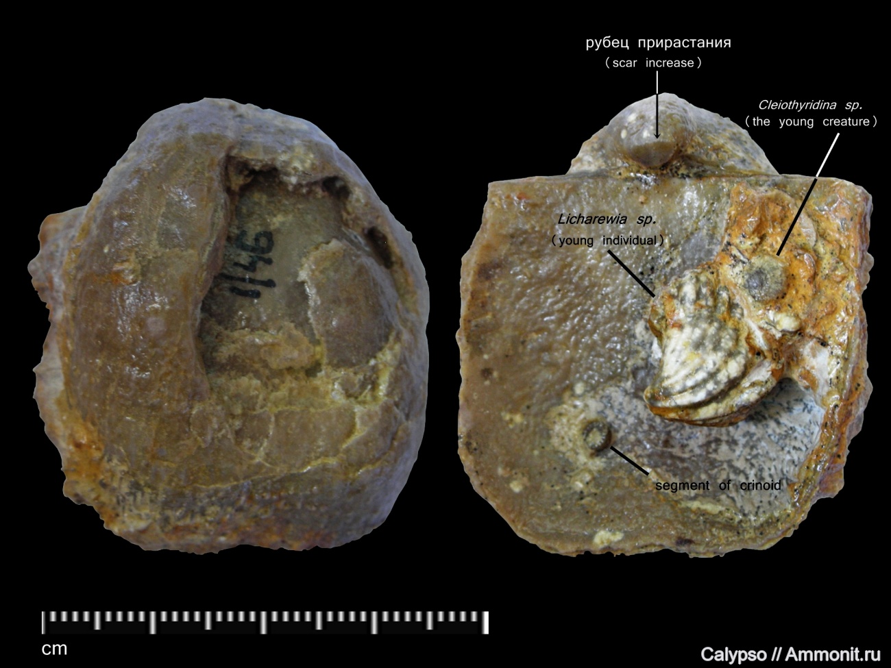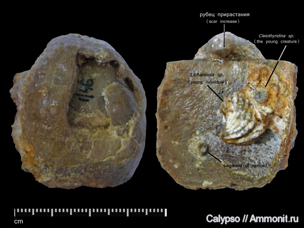 Немного деформированный (продавлена брюшная створка в средней её части) экземпляр с некоторой сопутствующей фауной в чаше спинной створки (выявлено в процессе расчистки):
