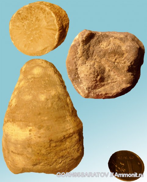 Этот небольшой коралл был найден в Тёпловском карьере Саратовской области.Интересен он тем что в его верхней части корала лежат иглы морских ежей sp и две створки брахиопод sp.на фото представлен коралл в разных ракурсах.В левом верхнем углу изображено увеличенное изображение основания коралла,ниже сам коралл, а сбоку та самая часть с иглами и брахиоподами.