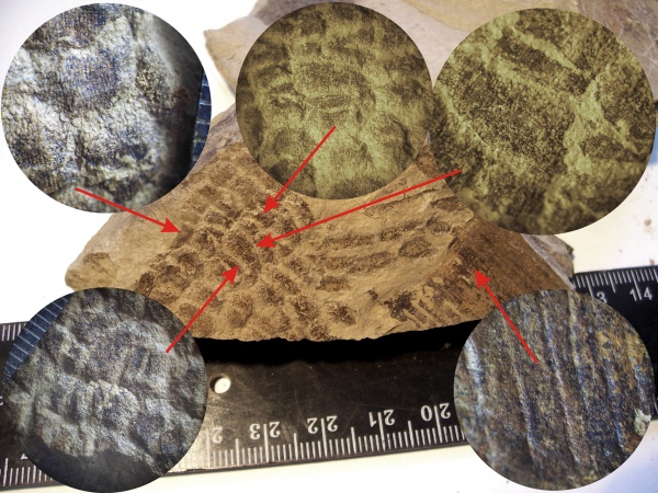 Это не моя находка, найдена на окраине Константиновки (Донецкая обл.). По мнению доктора Криса Клила (Chris Cleal - Wales National Museum) из Уэльса, это фрагмент какого-то членистоногого. Он слишком мал, чтобы сказать точнее.