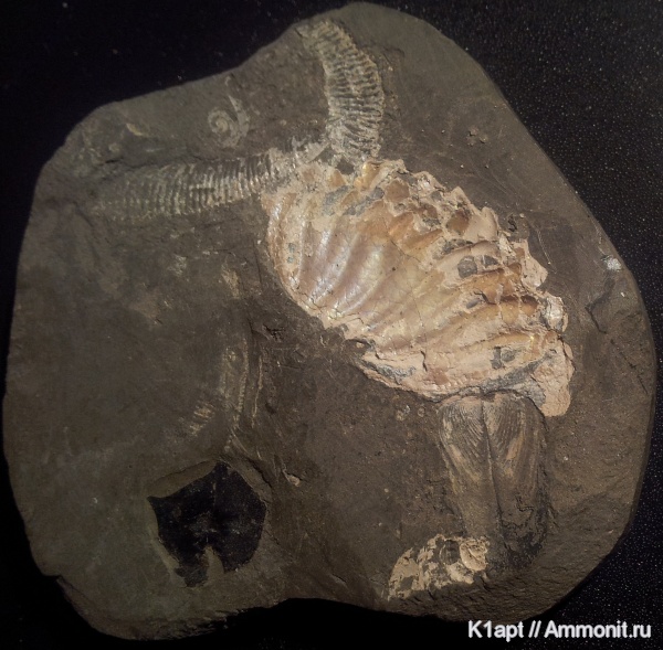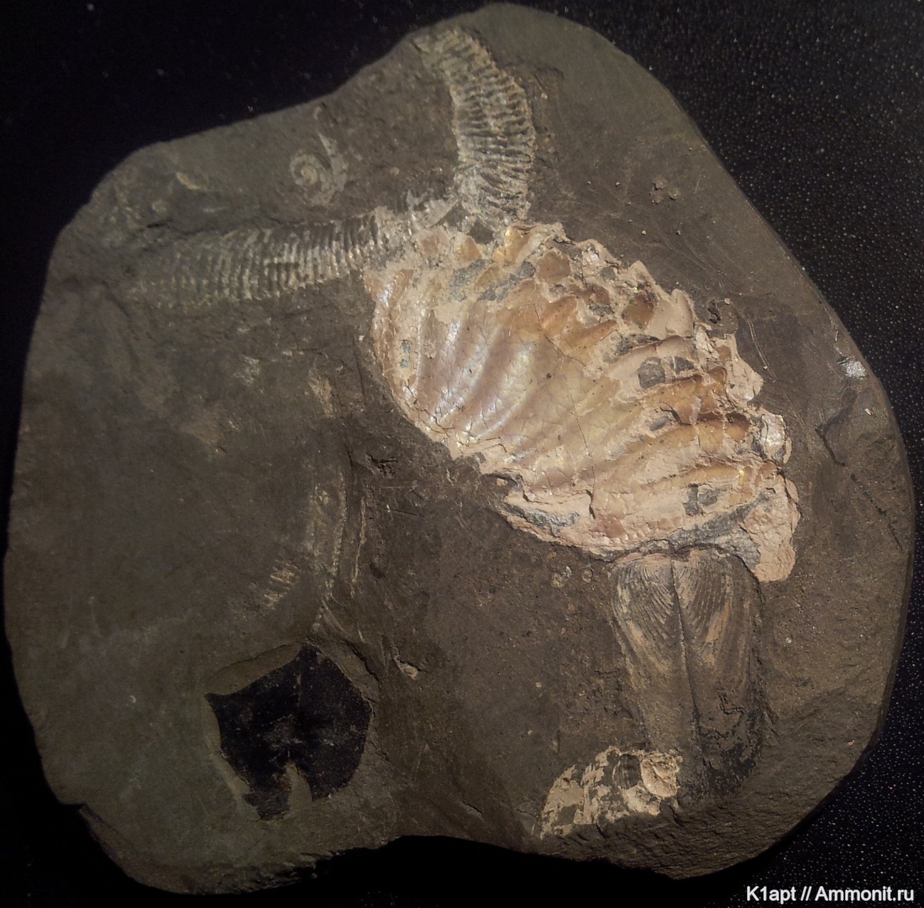 Отпечаток аптиха аммонита, предположительно рода Aconeceras на плитке глины. Снизу-слева - чешуя рыбы примерно 5 мм в длину. Вверху - гетероморфы Volgoceratoides.