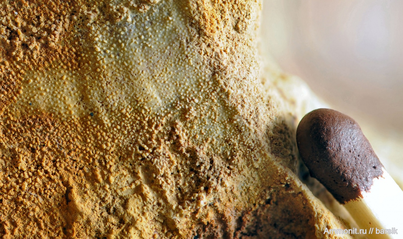 При увеличении хорошо видно микроструктуру аптиха. На этом снимке негативный отпечаток. Т.е. сам аптих имел тонко-ячеистую структуру, очень похожую на поверхность раковины брахиоподы.