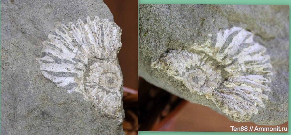 Половинка аммонита в породе. Извлечь не получиться - сам по себе хрупкий. Размер сохранившейся части по наибольшему сечению -3,7 см. Найден на р. Губс.