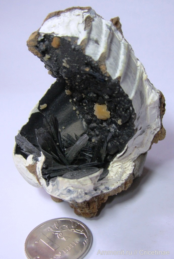 Куплена много лет назад на одном из палеонтолого-геологических базаров. Образец скорее всего из Керченского полуострова. Внутри замещение псиломеланом, вивианитом и баритом. Знатоков прошу поправить меня.