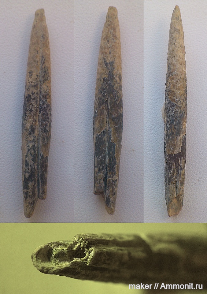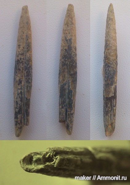 Не специалист по белемнитом. но думаю здесь при общем разрушении верхних чехликов нарастания очень глубоко обнажились брюшная борозда и две боковых. в которых располагалась хрящевая ткань крепления основания плавников. | ||||||