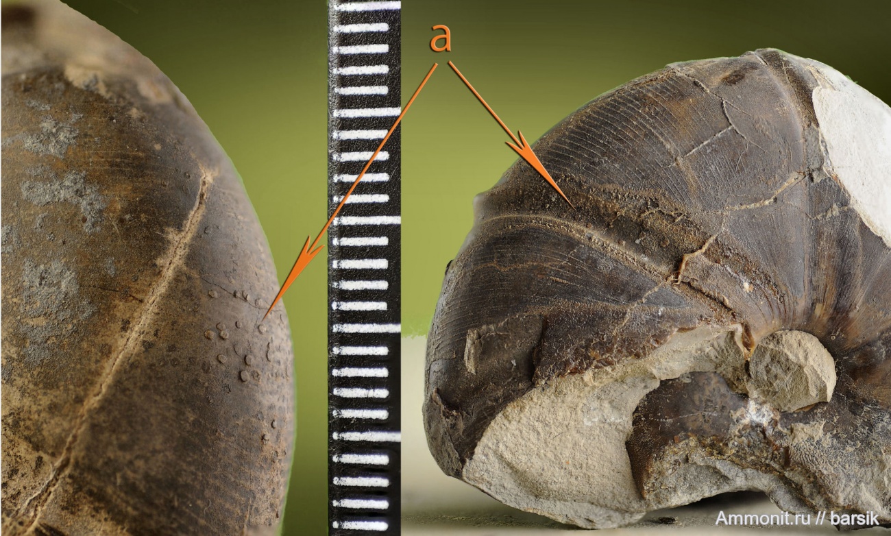 Вот это конечно вопрос. Я полностью согласен с тем, что это отпечатки дырок в стенке жилой камере, но кто и как их сделал - это очень интересный вопрос. Публикации на эту тему мне пока не попадались. В отличие от следов сверлений усоногих рачков на белемнитах (например Ростр белемнита со следами усоногих рачков) у аммонитов эти дырки всегда круглые, да и расположены они на разных сторонах раковины. В общем пока не понятно кто или что дырявило раковины.
