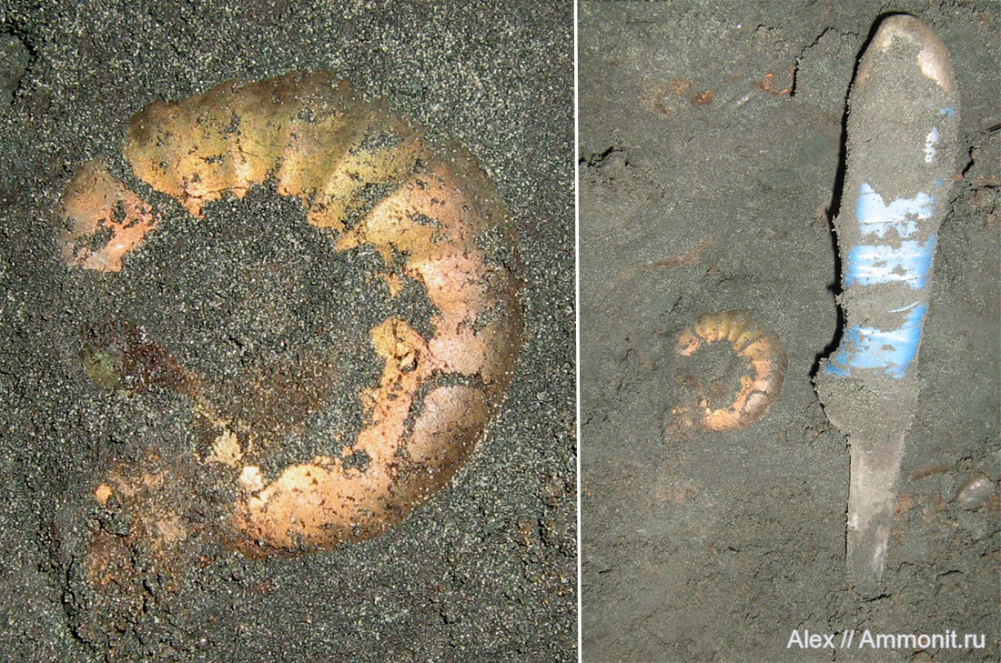 Диаметр аммонита 7 см. Вот так они и попадаются в зоне fulgens. Интересно, что захоронен он не горизонтально, а под углом, но раковина не деформирована (многие вертикально стоящие аммониты оказываются смяты). Такого аммонита нельзя расчищать прямо на месте - его нужно вырезать вместе с куском вмещающей породы и аккуратно везти с собой, а уже потом, в спокойной обстановке проклеивать и затем расчищать. Только к сожалению серединка у раковин такого размера тут практически никогда не сохраняется ((