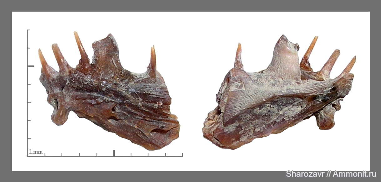 Интересная находка. И сохранилась хорошо, даже зубы целы остались. Эта рыба, вероятнее всего ихтиофаг (питалась другими рыбами). Об этом говорит крупный зуб, своего рода клык, среди других, более маленьких.Такое устройство помогало удерживать небольшую и быструю добычу.Вырост у переднего края нижней стороны челюсти, скорее всего, опора для крепления крупной связки, соединявшей ветви челюстей. | ||||||