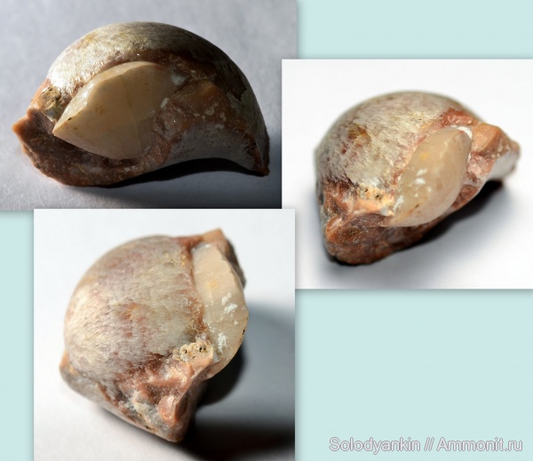 Необычный образец попался, раковина большой брахиоподы с двумя сомкнутыми створками имеет скол из которого торчит раковина брахиоподы поменьше и тоже с двумя створками.