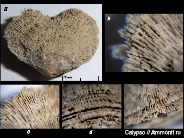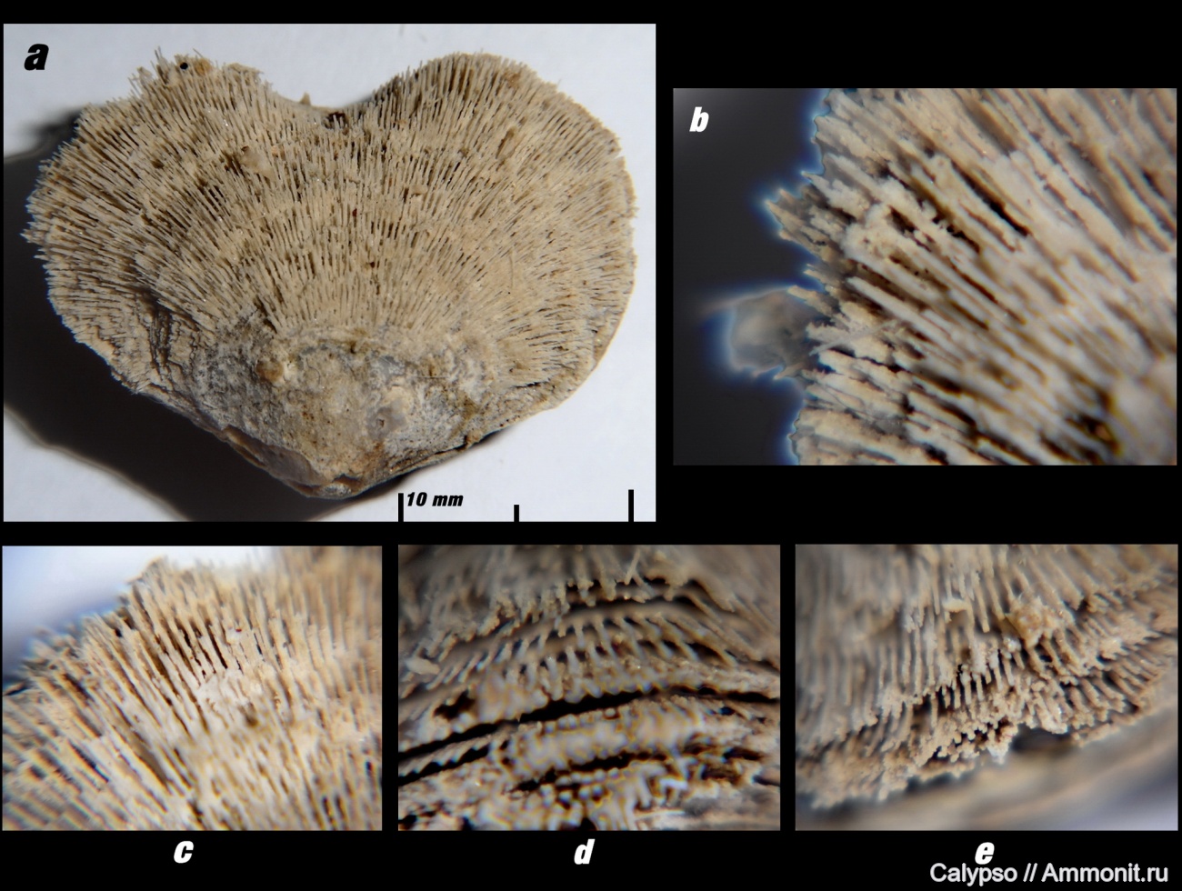 Врезки [d] и [e] показывают ярусность тончайших иголочек на концентрических складках нарастания.