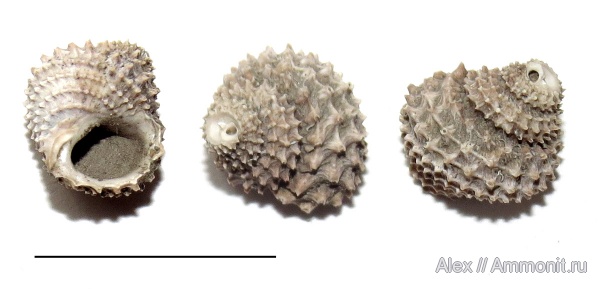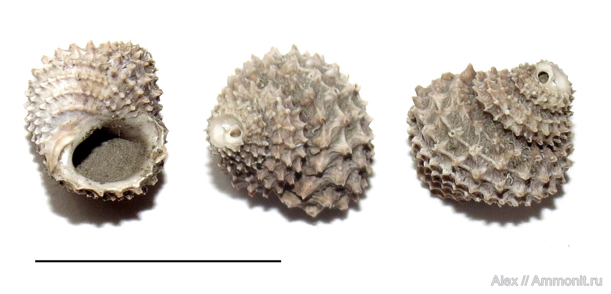 Гастропода Eucyclus sp. из карьера Пески. Раковина маленькая - длина масштабного отрезка 1 см. К сожалению, не совсем целая (верхушка обломана). В таком виде она и была найдена в отвалах.