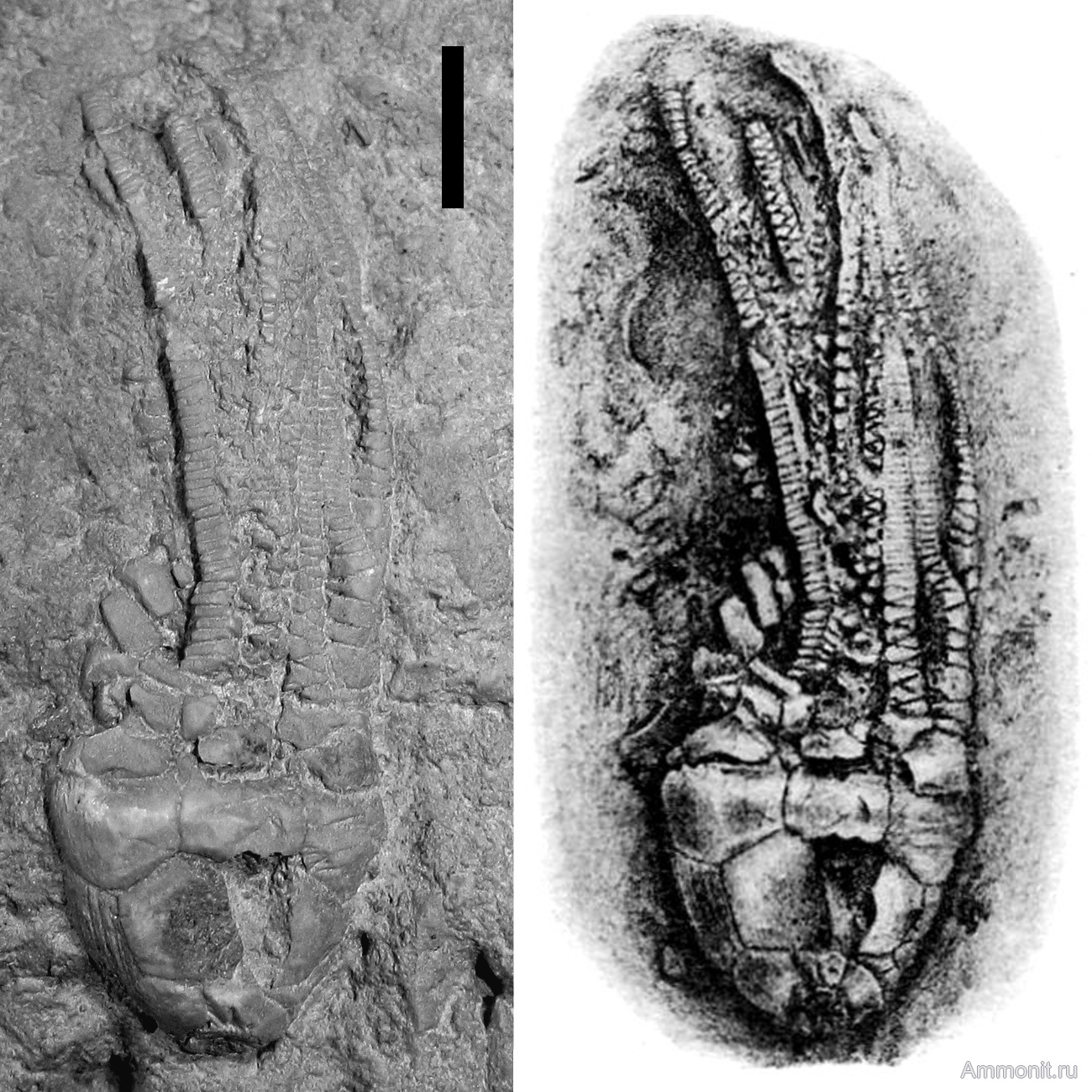Крона морской лилии (сам экземпляр (длина масштабной линейки 1 см) и оригинальный рисунок из работы А.А. Штукенберга).