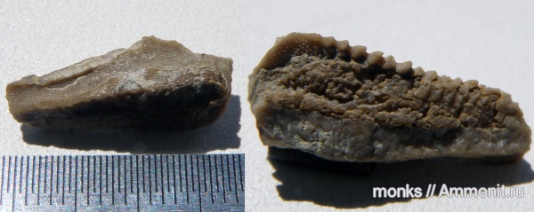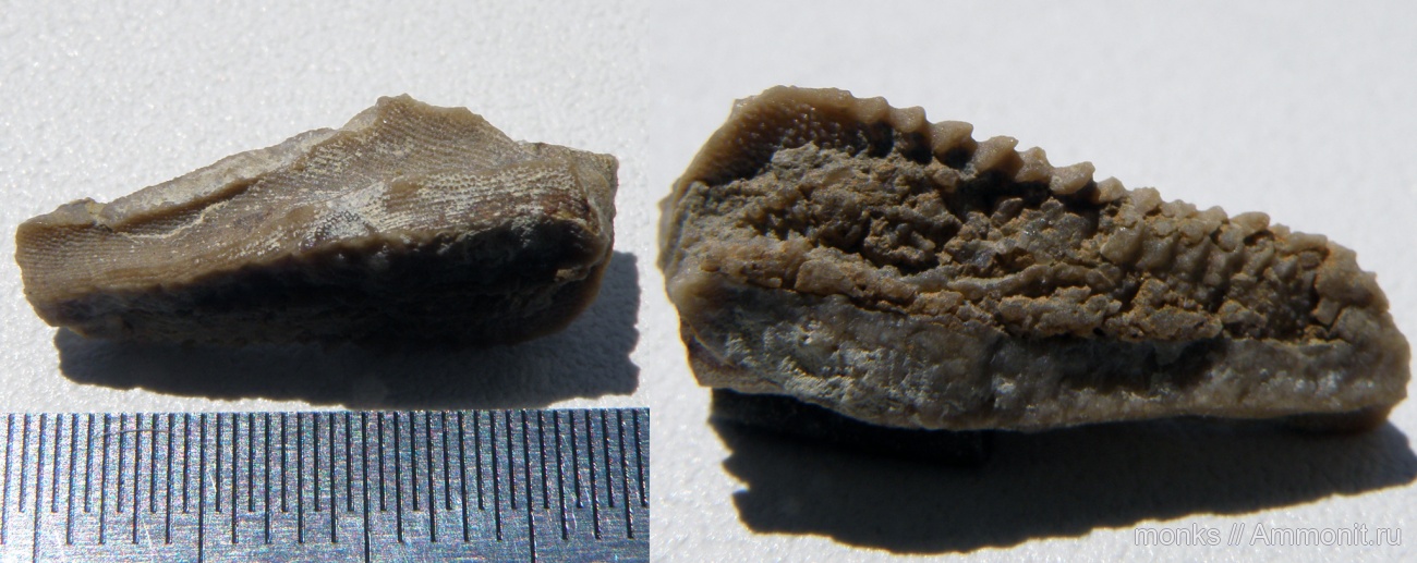 На мой взгляд это обломок клешни ракообразного. Для юрской рыбы уж очень странная поверхность, и особенно смущают зубы - у рыб ведь зубы это отдельные образования в челюсти, а тут просто выросты, выступы по краю. Думаю, что это клешня какого-то крупного ракообразного. | ||||||