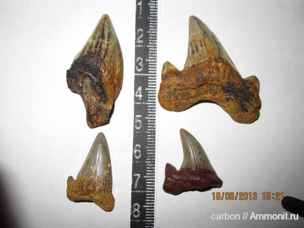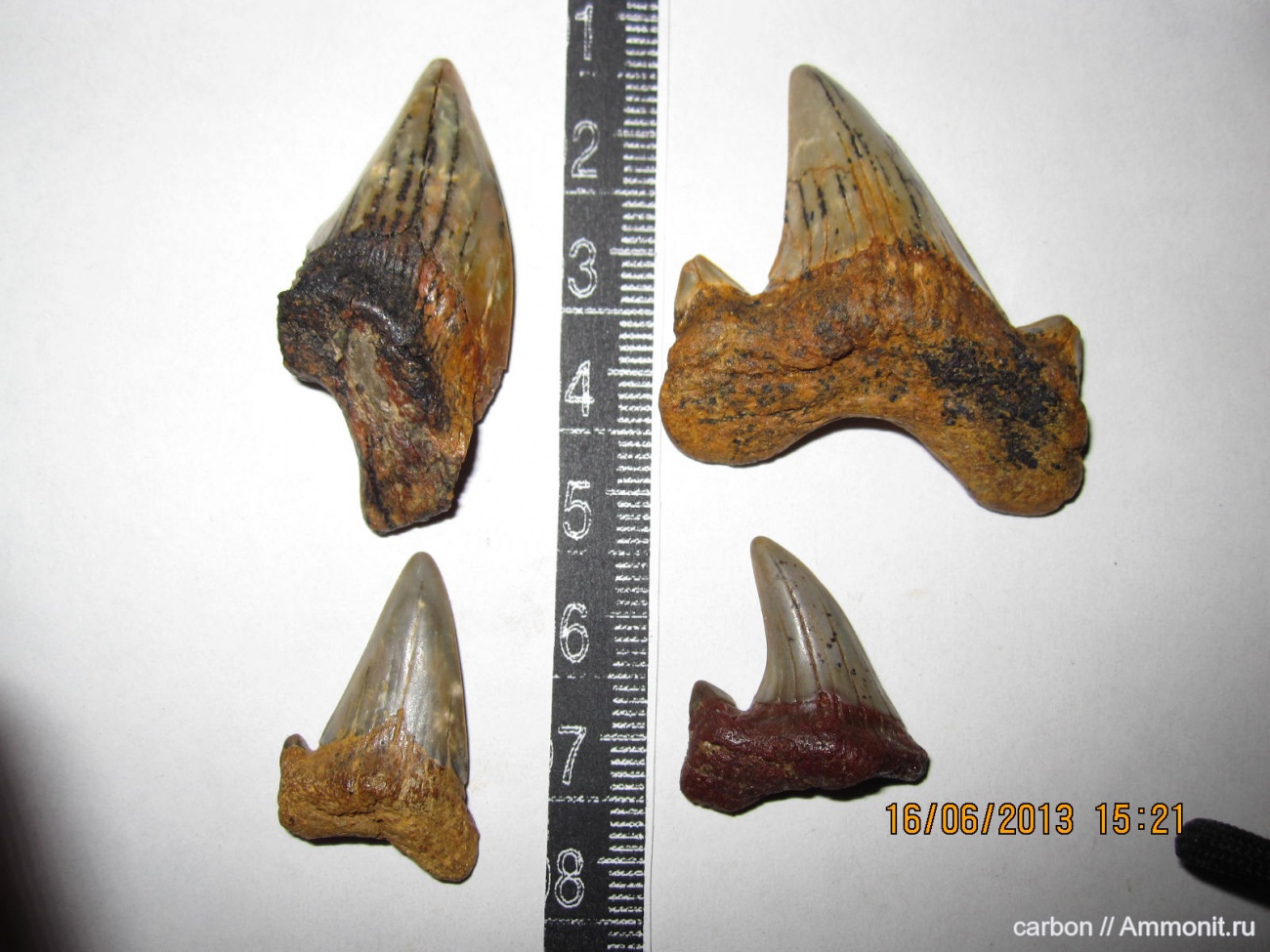 Это не мел, а ниж.палеоген (зеландий - тенет). Все зубы - Otodus aff. minor, верхний левый под вопросом, нужно больше ракурсов. | ||||||