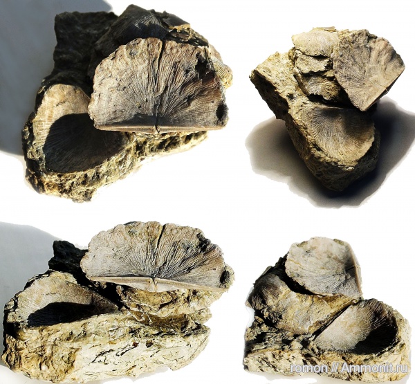 Известняковая плитка с брахиоподами Douvillina, глину удалил получилась такая композиция. Возможно прижизненное положение раковины при захоронении.