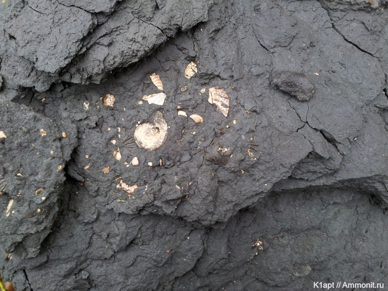 Всё что блестит это фрагменты раковин аммонитов. Можете не сомневаться. Кости рептилий тёмные и не блестящие. Вон тот кусочек справа возможно то о чём Вы говорите, но лучше бы переснять. | ||||||
