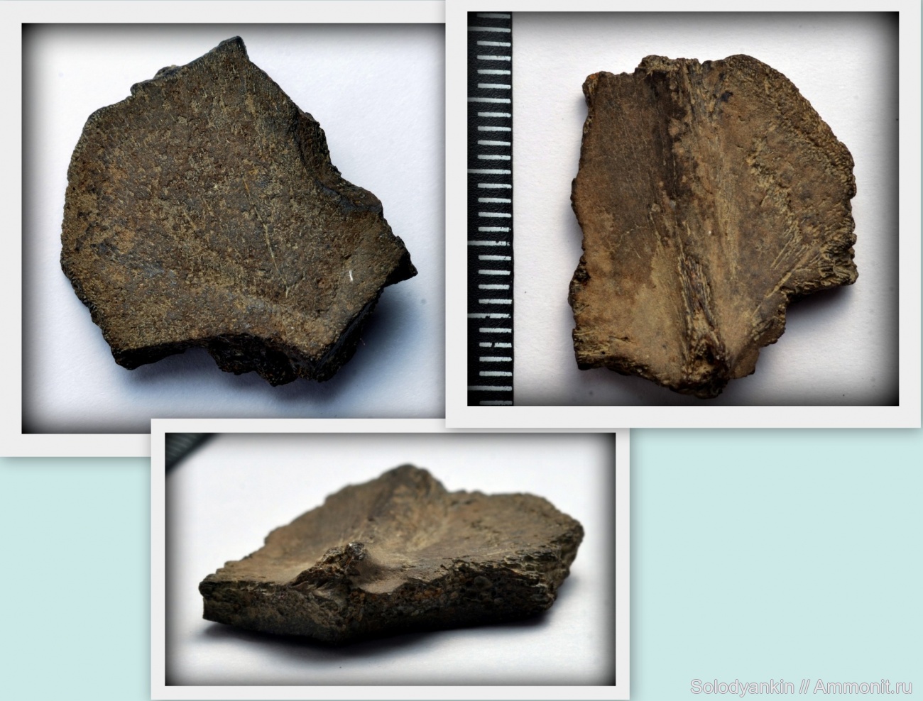 Также вычитал, что границы поверхностных роговых щитков часто отпечатываются на поверхности костного карапакса. Сверху обломка наблюдается как раз "V"-образная вмятинка.(левый верхний кадр)