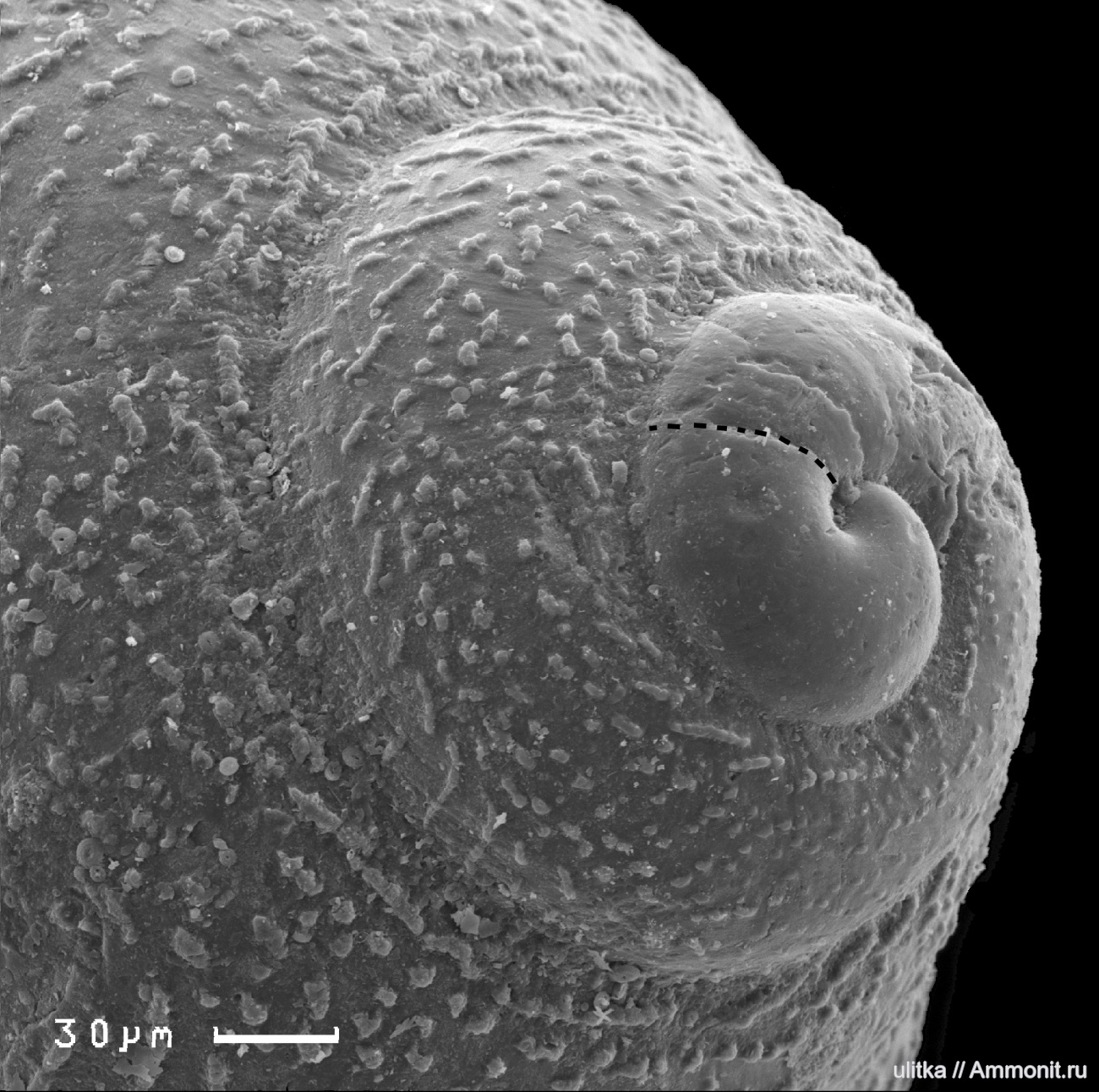 Пунктиром показана эмбриональная часть протоконха, т.е. та часть раковины, которая сформировалась в яйце (далее следует личиночная часть раковины, начало которой эродировано)