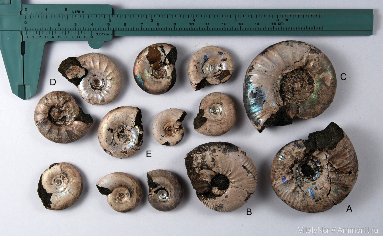 Предположу, что под буквой D, тот, который с худшей сохранностью, может быть Kachpurites tenuicostatum. | ||||||