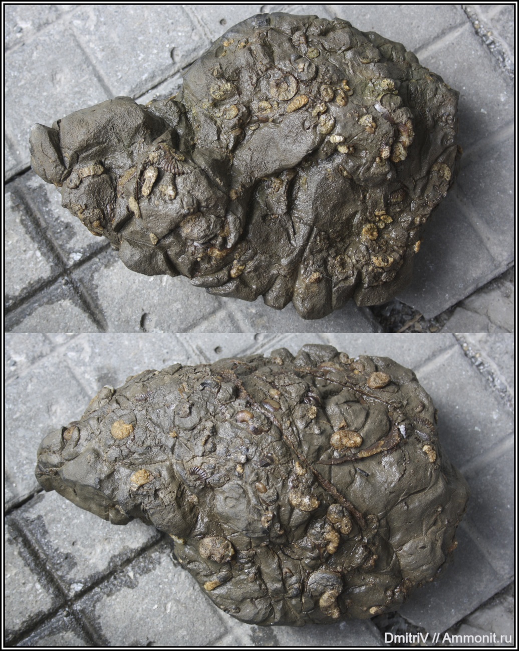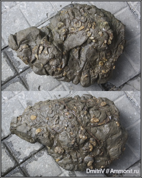 Если пошли фото аммонитов из этой конкреции, то это "фотография на память". Сфотографировал и приступил к вскрытию. | ||||||