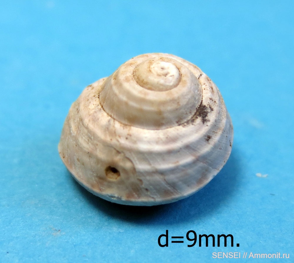 Характерное отверстие,конической формы,на раковине семейства Trochidae-след сверления какого-то хищника. Встречается на раковинах неогеновых моллюсков довольно часто. След сверлильшика. , Повреждение раковины гастроподы. , Целая двустворка. Неоген.
