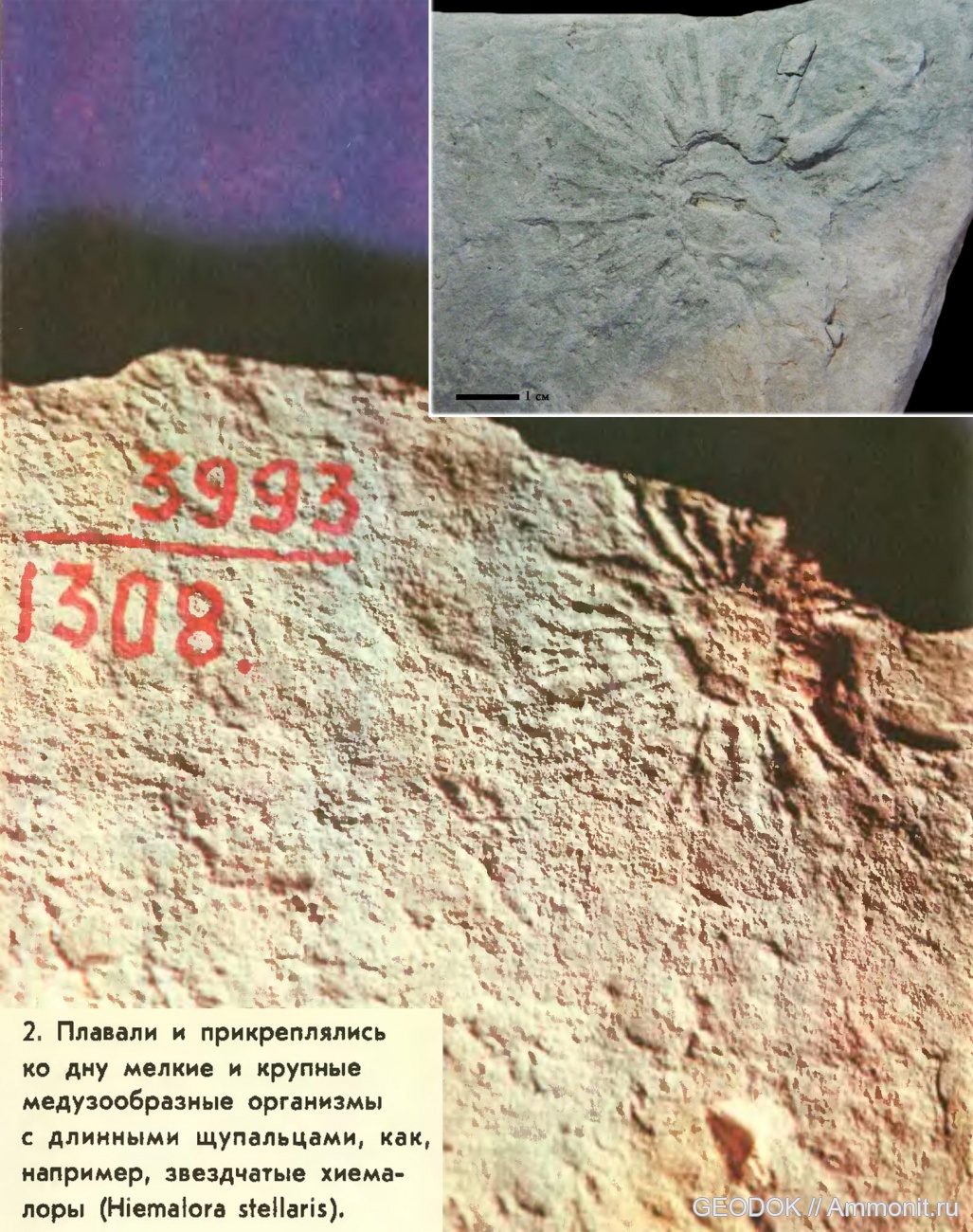 Почему-то раньше было принято считать подобные лучевые образования медузами. Непонятно, чем руководствовались при этом, как неясно, могут ли в принципе оставаться подобные следы от медуз. Если погуглить на тему отпечатков медуз, то мы их действительно увидим, вполне внятные отпечатки, но, ничего похожего на подобные лучистые образования. Я специально вставил пояснение к фотографии из этой книги, в нем даже объясняется, как эти отпечатки образовались - звездчатые хиемалоры с длинными щупальцами "плавали и прикреплялись ко дну".