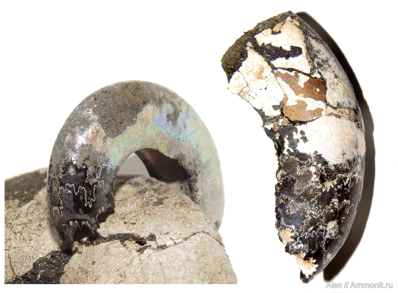 Два небольших обломка раковин аммонитов Kachpurites fulgens с сохранившимися лопастными линиями. На сайте уже есть лопастные линии этих аммонитов (Лопастная линия Kachpurites fulgens и Лопастные линии Kachpurites sp.), но поскольку у разных экземпляров они здорово различаются, эти два образца не будут здесь лишними.