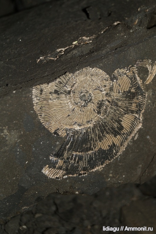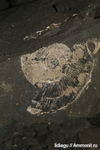 Отпечаток аммонита около 30см найден в сланце при разборке вывала в проходческом забое. Шахта "Новокашпирская"