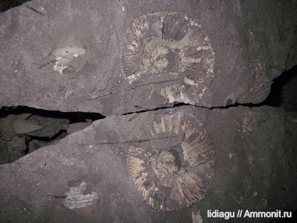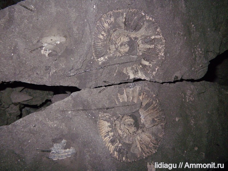 Отпечаток аммонита и игл морских ежей в сланце. Шахта "Новокашпирская"