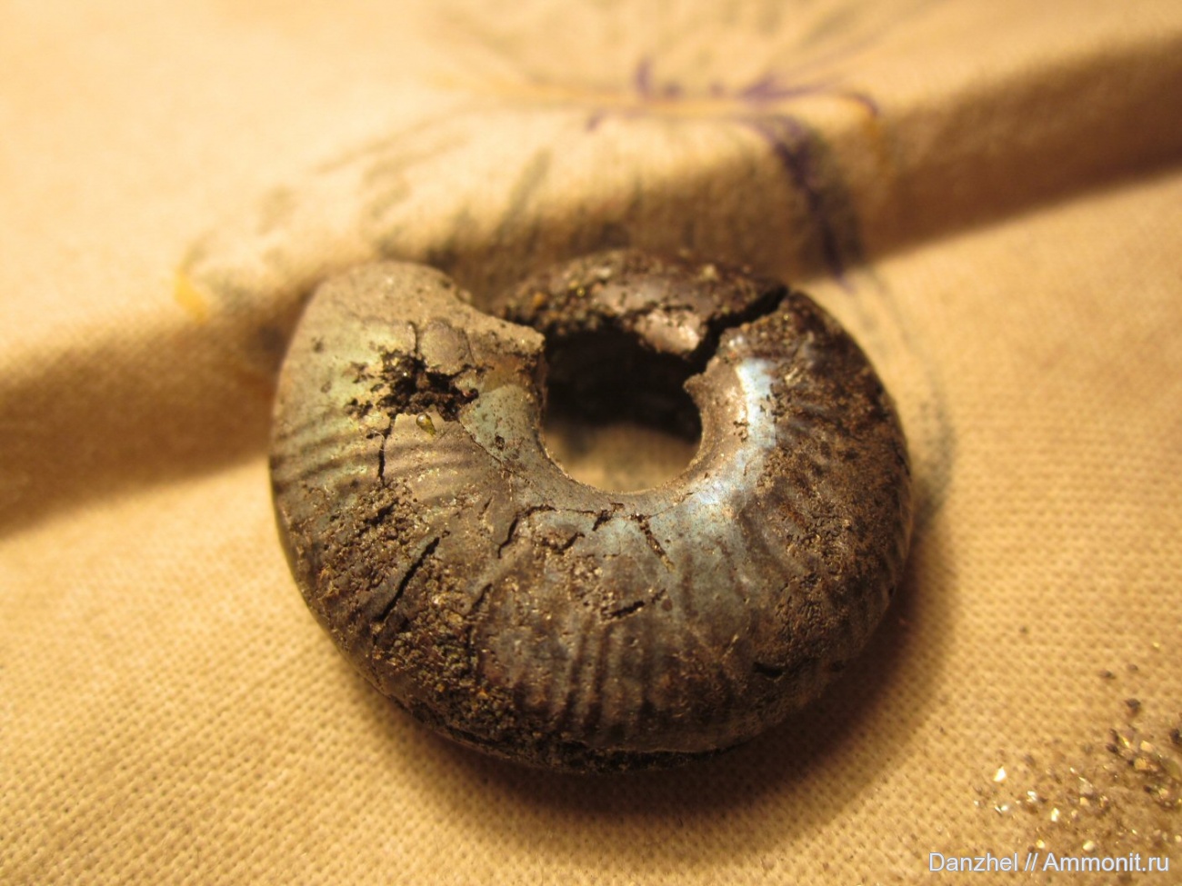 Перламутровый аммонит рода Virgatites, найденный на реке Шмелевка, в Москве, 13 июля 2013 года.