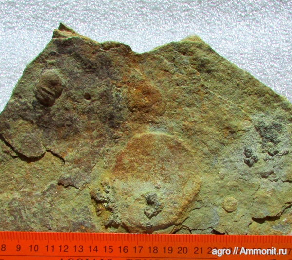 Glaessneria imperfecta Gureev, 1987 со следами пиритизации и слева вверху дальний родственник трилобитов.
