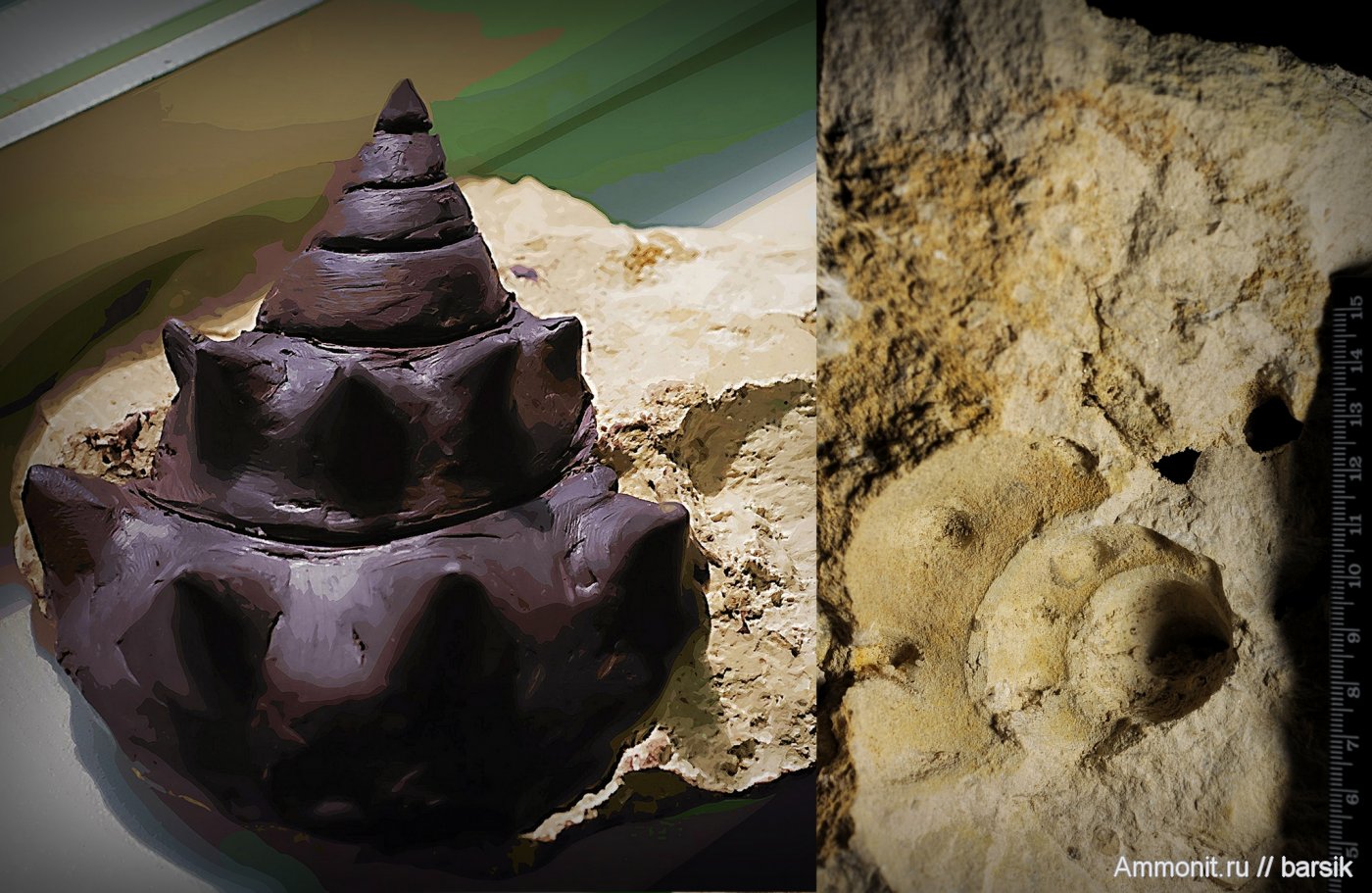 Молодые обороты без шипов бывают. У меня есть современные гастроподы из тропических морей, у которых первые три-четыре витка абсолютно гладкие и одинаковые у разных видов, а потом резко появляются шипы, причем, у каждого вида своей формы. | ||||||
